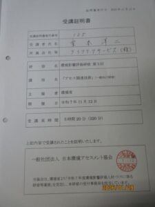 日本環境アセスメント協会が実施する認定資格試験(17回目)で、環境アセスメントの実務業務を行う「環境アセスメント士」の試験を資格教育センタ-事務局長として企画、運営を行った。