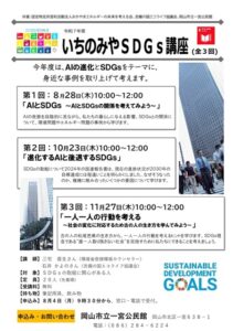 ESD等に主体的に取り組んできた岡山市一宮地区で、さらに持続可能な社会の構築に向けた活動を進めるため、1972年の国連環境計画設立を起点として現在までの世界の取り組みを概観した。2時間の講座であるが、SDGs目標達成度のチェック等を身近な題材に視点をおいて参加型で展開したため、講座後のアンケートでは90%の参加者に高い評価をいただいた。「SDGs はとても重要な、大切なことだと思いました。歴史的な歩みがわかり、やっと事の重大さを実感できました。」等の回答が多く、成果があがったと思われる。