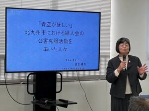 「北九州市生涯学習総合センターの「市民カレッジ」において行われた「環境~さまざまな視点から~ 第5回 青空がほしい運動~もう一つの視点から学ぶ公害克服物語(座談会)~の中で、婦人会の活動を紹介した。その後、行政や企業の公害克服活動について他の登壇者が語り、多視点からこの歴史を語ることの意義を語り合った。