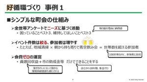 市内で特色のある市民をスピーカーに招き、皆でその人の話を聴く会に登壇した。地域コミュニティ形成を軸としたスピーチを実施したが、その中で、町会における資源回収とそれによる活動資金形成の事例を紹介した。