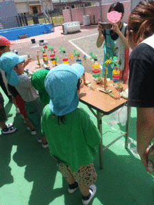 地球温暖化について、まず屋外で、ソーラー噴水、ソーラーおもちゃ等を体験し、その後幼児にもわかるように、優しい言葉と絵のパワーポイントで解説しました。