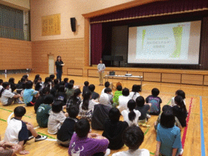 5年生の1時限の授業を、クラスごとに前半・後半でお話と体験のグループに分け、別の講師と手分けして、私は屋内の、パワーポイントによる地球温暖化についての解説を行いました。省エネ等でCO2をはじめとする温室効果ガスを削減することで、地球温暖化防止につながることを伝えました。