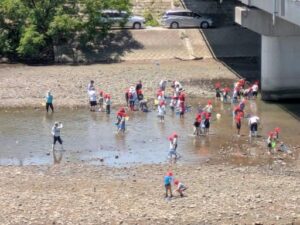 杵築市に流れる八坂川の地元の小学校、3年生、4年生約50名の90分の観察会の講師をした。八坂川は25年前に100年に一度と言われる洪水があり、その時に行われた環境影響調査により、カブトガニを始め、絶滅危惧種や固有種が多く生息していることが分かった。地元で25年を超えて環境活動をしている実績を認められ、学校のゲストティーチャーとして招聘された。子どもたちは授業で調べ学習をし、その成果の実証を兼ねて参加していた。最後にみんなで獲った生き物の名前を確認しあい、川に戻した。