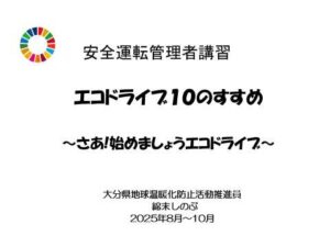 安全運転管理者講習で国東市にてエコドライブの実施についての有用性を説明した。中津市、杵築市、津久見市と県内4会場で20分550名の対象者で実施した。エコドライブは二酸化炭素の削減だけでなく、燃料代の節約、事故の減少などのメリットがあり、個人としてだけでなく、企業として実施することで企業イメージがよくなる燃料費の節約に加え事故の減少、二酸化炭素削減減らせるというメリットがあること、職場全体と取組む成果を説明した。