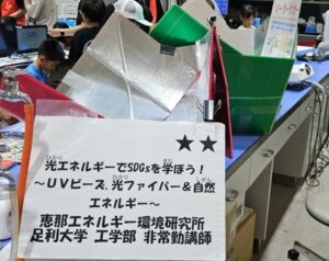 1.分光万華鏡 2.ソーラークッカー 3.光ファイバー などの手作りや展示を行った。SGDsの展示や資料提示し,環境教育とSDGsのコラボレーションの形で展示や活動を行った。