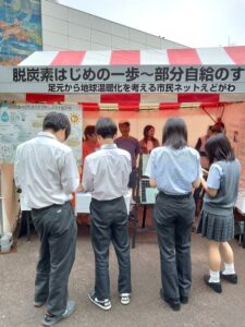 所属団体の江戸川区環境フェア2023への出展にあたり、再生可能エネルギー関連グッズの展示や発電した太陽光発電の電気を使ったボトル刻印サービスを企画し、企画内容を通じて環境フェア来場者とのコミュニケーションや情報提供を行った。また、ソーラークッカーが燃料を使わずお湯を沸かす様子に興味深く話を聞く区議会議員も見られた。