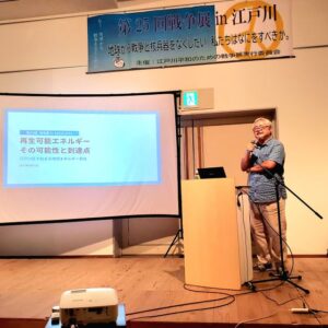 第25回戦争展in江戸川実行委員会からの依頼を受け、「再生可能エネルギー、その到達点と可能性」と題した講演を行い、所属団体での実践や新たに設立される地域エネルギー会社の動きを解説し、再生可能エネルギーの普及・拡大の可能性について伝えた。