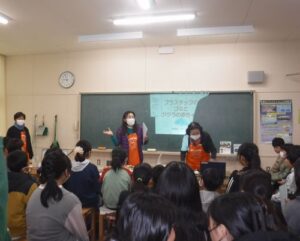 パワーポイントでクイズを出しながらマイクロプラスチックを子供たちと一緒に考える。