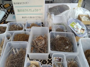 野鳥の巣を展示して、鳥の巣当てクイズを行った。来場者には実物に触れる機会の少ない巣を見ることで、巣材や巣の形からその鳥が生息する環境について体感してもらった。
