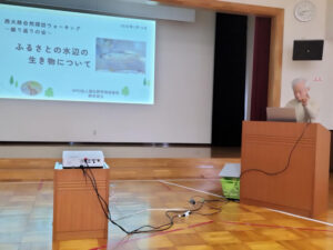 西大路公民館が令和7年度に4回開催した観察会「西大路自然探訪ウォーキング」の振り返りの会にて、第1部「ふるさとの自然について考える」にて、日野の水生生物についてプレゼンテーションを行い、魚や水生生物の紹介と外来種の魚の状況、かつての川や水路の変化と魚の変化などについて紹介した。また、第2部のワークショップ2025年の「西大路自然探訪ウォーキング」を振り返るコーナーにて、日野の自然環境の現状や子どもたちに地元の自然環境に関心を持ってもらうための方策などについて、参加者や行政担当者と意見交換を行った。
