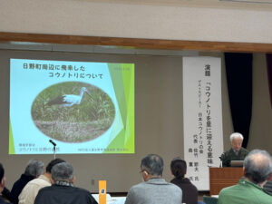 2025年8月に日野町にコウノトリが数羽飛来したが、その情報を日本コウノトリの会が運営する目撃情報「コウノトリ市民科学」に登録するとともに、日野町役場の環境政策担当者に連絡した。折しも環境基本計画が策定され、その中の実践活動のひとつで『みんなで取り組むプロジェクト』の活動の一環として、コウノトリをテーマに日本コウノトリの会の会長や幹部の方を招いて環境学習会が開催された。自分は日野町内外の人からコウノトリの目撃情報を収集し、環境学習会当日に飛来情報やコウノトリの見分け方、習性などを紹介した。