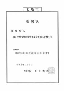 令和8年1月1日から令和9年12月31日までの期間、七尾市環境審議会委員として委嘱された。
