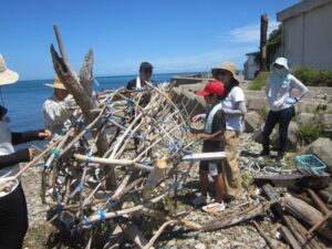 企業環境活動の一環、海の環境教育と海岸漂着物からのアート(流木と石)使った環境アート体験学校を企画開催。延べ21名が参加
