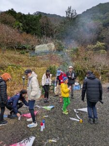 1.プログラム:1)ミニ門松づくり 2)餅つき 3)正月遊び(駒回し、羽子板、他) 2.人数:参加者 17人 スタッフ他19人 計36人 3.概要:ミニ門松づくりは、孟宗竹を利用して松竹梅を飾った。餅つきを地域の人たちに参加してもらい、子供達も餅つき体験をした。駒回しは、始めはできなかったがみんな回せるようになった。里山の暮らしを楽しく過ごしいい活動でした。