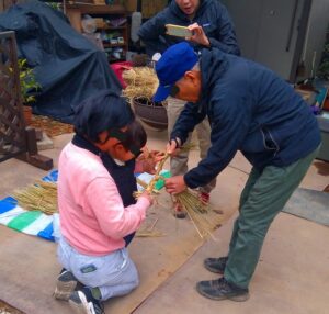 自主保育を行っているグループのリーダーに、しめ縄づくりを教えました。