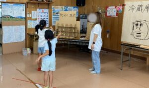 1回あたり50分で4回、環境学習を実施してほしいとの依頼でしたので、温暖化の仕組みや私たちの日常生活への影響等についてのお話しの後、省エネに向けた取り組みとして、家庭の機器別消費電力量が一番多いと言われている冷蔵庫について、段ボールでつくった冷蔵庫を使いながらエコな使い方について紹介させていただきました。
