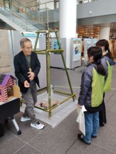 また、各所で自然災害が発生していることから、倒れた木で切れた電線には触らない、大停電「ブラックアウト」の仕組みと私たちができる対策について模型で体験していただきました。工作では、身近にあるススキを使った輪ゴム鉄砲とペットボトルを使ったエコカーをつくり遊んでいただいた。