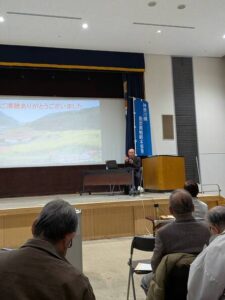 横浜市老人福祉施設福寿荘にてタイトルに示す講演を行った。同施設の利用者年齢層は活動に十分若く、期待して企画した。市広報や看板で聴衆者を募って貰ったが参加者は前期高齢者層二十数名であった。温暖化、プラごみいずれも世界の危機的状況から地域周辺の課題を考察した。温暖化に関しては屋根置き太陽光設置の勧め、プラごみに関してはゴミ集積所の管理強化を訴えた。またこれら課題の起源は我々の世代にあること示し、今からでも活動を起こすよう説いた。