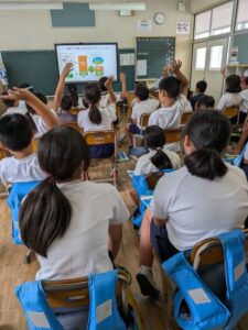 先の浜崎小学校6年生に続き下田小学校5年生(36名)にプラスチック海洋汚染及び温暖化の2項目に関して出前講座を行った。内容はほぼ同じであるが、今回は特に帰宅後に家族と講座内容を伝えて貰うために親世代の汚染責任について資料を追加して、『こんなことを講師から言われたよ』と言って話しに加わって貰うように仕組んだ。