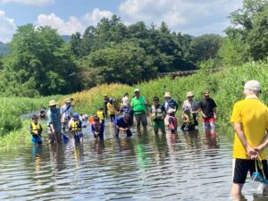 埼玉県内の親子を対象に、魚捕りの魅力と川の自然を知ってもらうことを目的として高麗川で楽しみながら伝統的な地引網・刺網漁や魚釣り体験し、魚の生態、生息環境、魚捕りのルール、安全などを学びました。埼玉県からの「プラスチックごみを流さない」リーフレットも配布し、海ごみが流れる仕組みについても一緒に学びました。